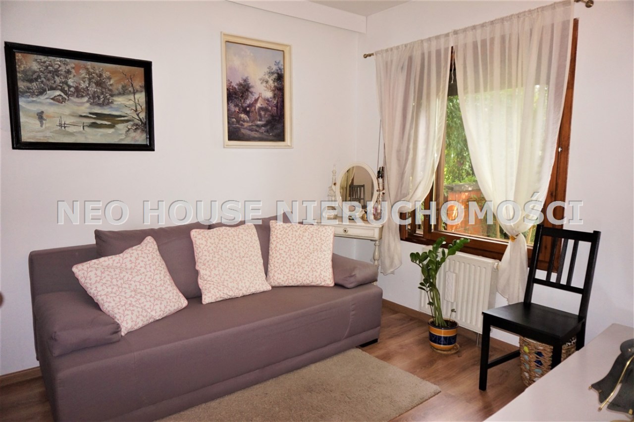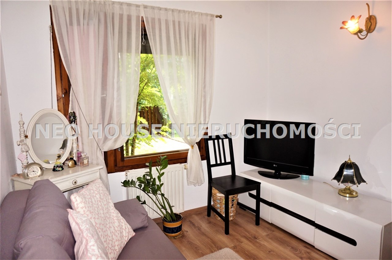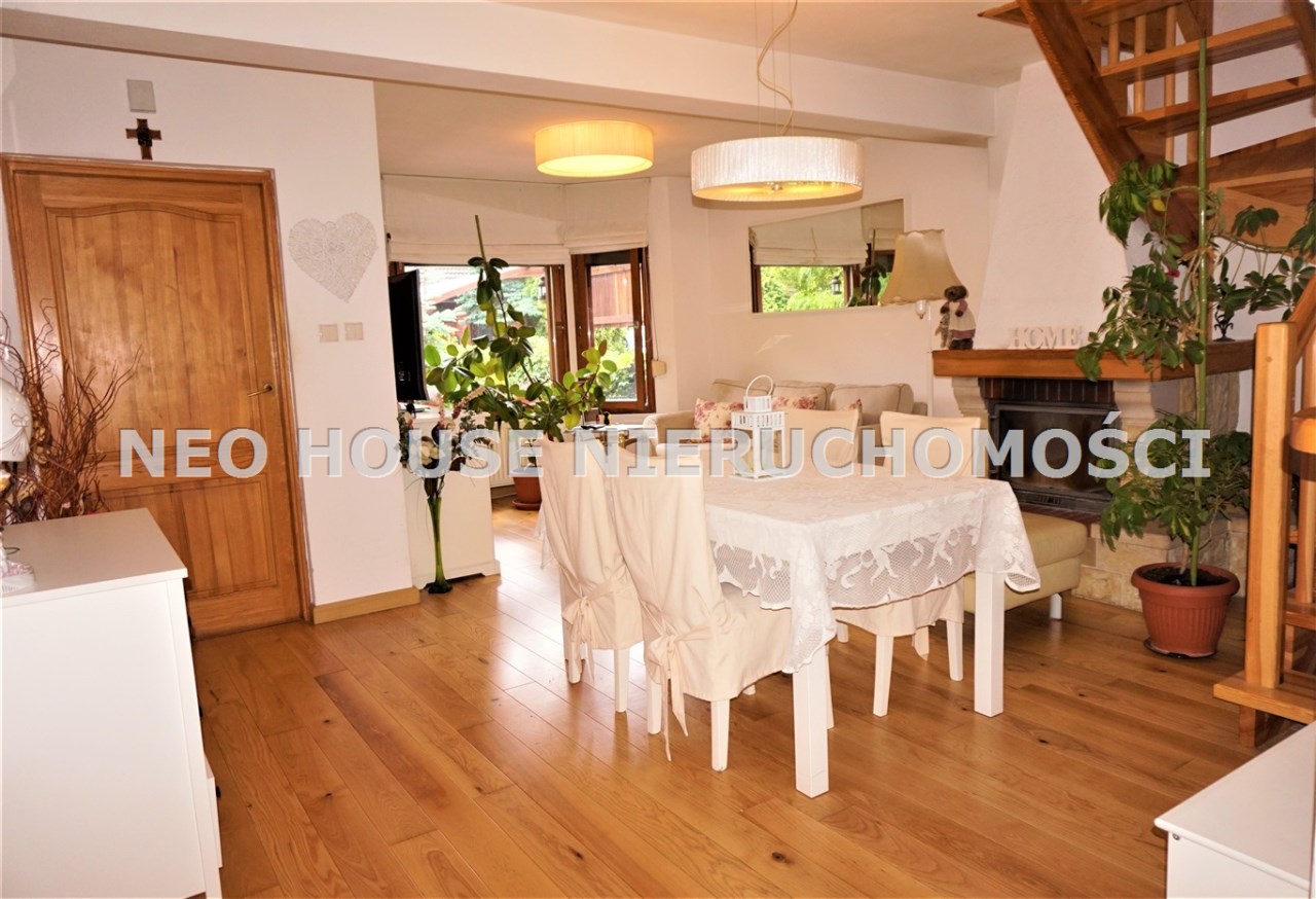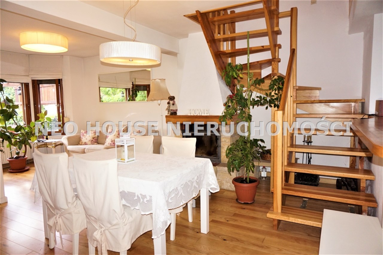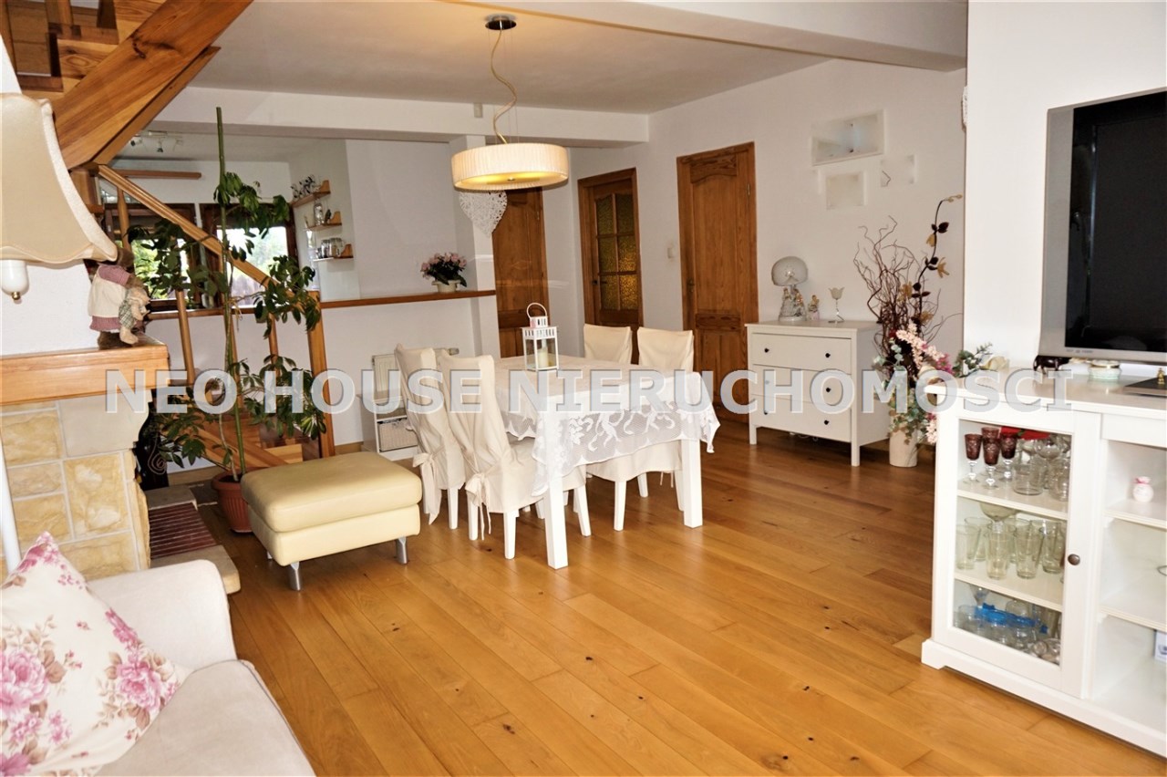 Wejście przez wiatrołap od południa do przestronnego, jasnego salonu z wykuszem. Okna i drzwi do ogródków od północy południa. Kuchnia wykończona i wyposażona, salon z jadalnią z oknem od południa. Na podłogach deski drewniane i panele. W salonie ozdobny kominek, który w chłodne dni jest źródłem dodatkowego ciepła. Na parterze znajdują się również dwa zgrabne pokoje, spiżarnia z piecem gazowym oraz łazienka z kabiną prysznicową i dużą, narożną wanną. Na poddasze prowadzą drewniane schody.