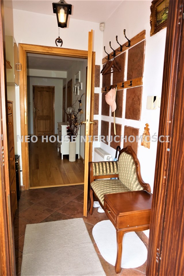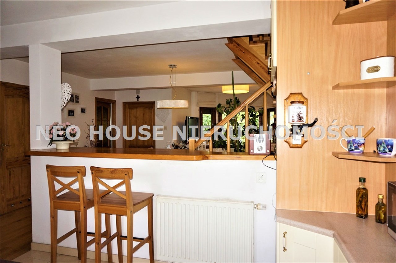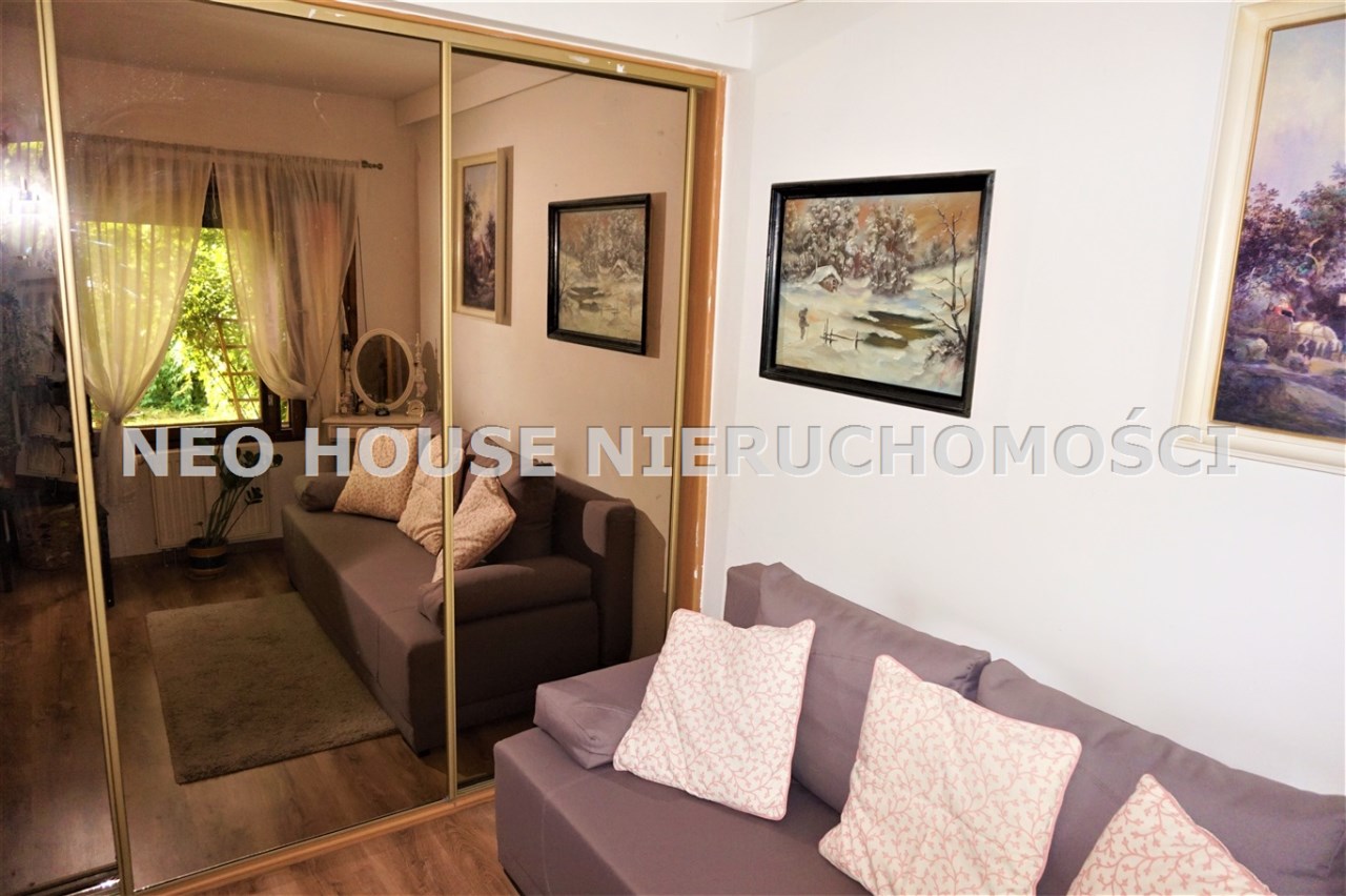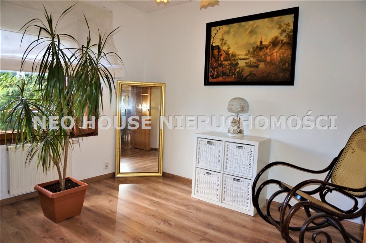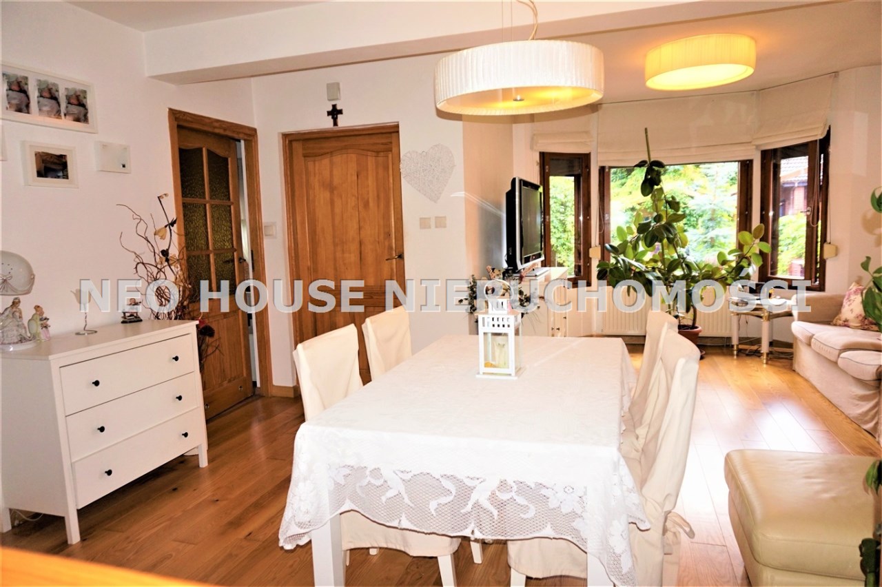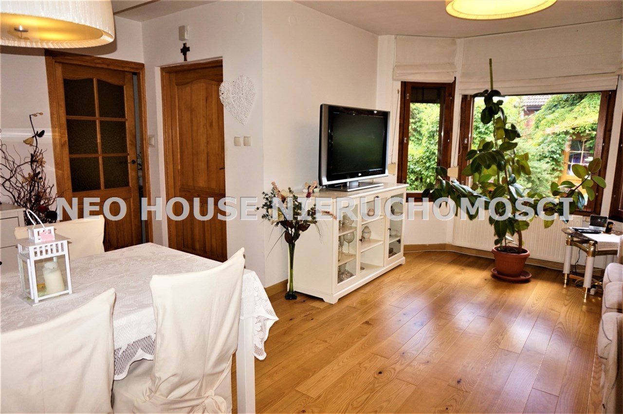 Wejście przez wiatrołap od południa do przestronnego, jasnego salonu z wykuszem. Okna i drzwi do ogródków od północy południa. Kuchnia wykończona i wyposażona, salon z jadalnią z oknem od południa. Na podłogach deski drewniane i panele. W salonie ozdobny kominek, który w chłodne dni jest źródłem dodatkowego ciepła. Na parterze znajdują się również dwa zgrabne pokoje, spiżarnia z piecem gazowym oraz łazienka z kabiną prysznicową i dużą, narożną wanną. Na poddasze prowadzą drewniane schody.