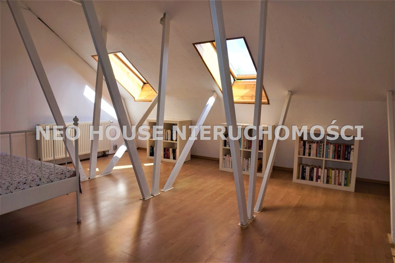 Wydzielono tam dwa pomieszczenia garderobiane o powierzchni około 3 m2 i 11 m2. Dostępną przestrzeń można ewentualnie podzielić, okna dachowe po przeciwległych stronach.