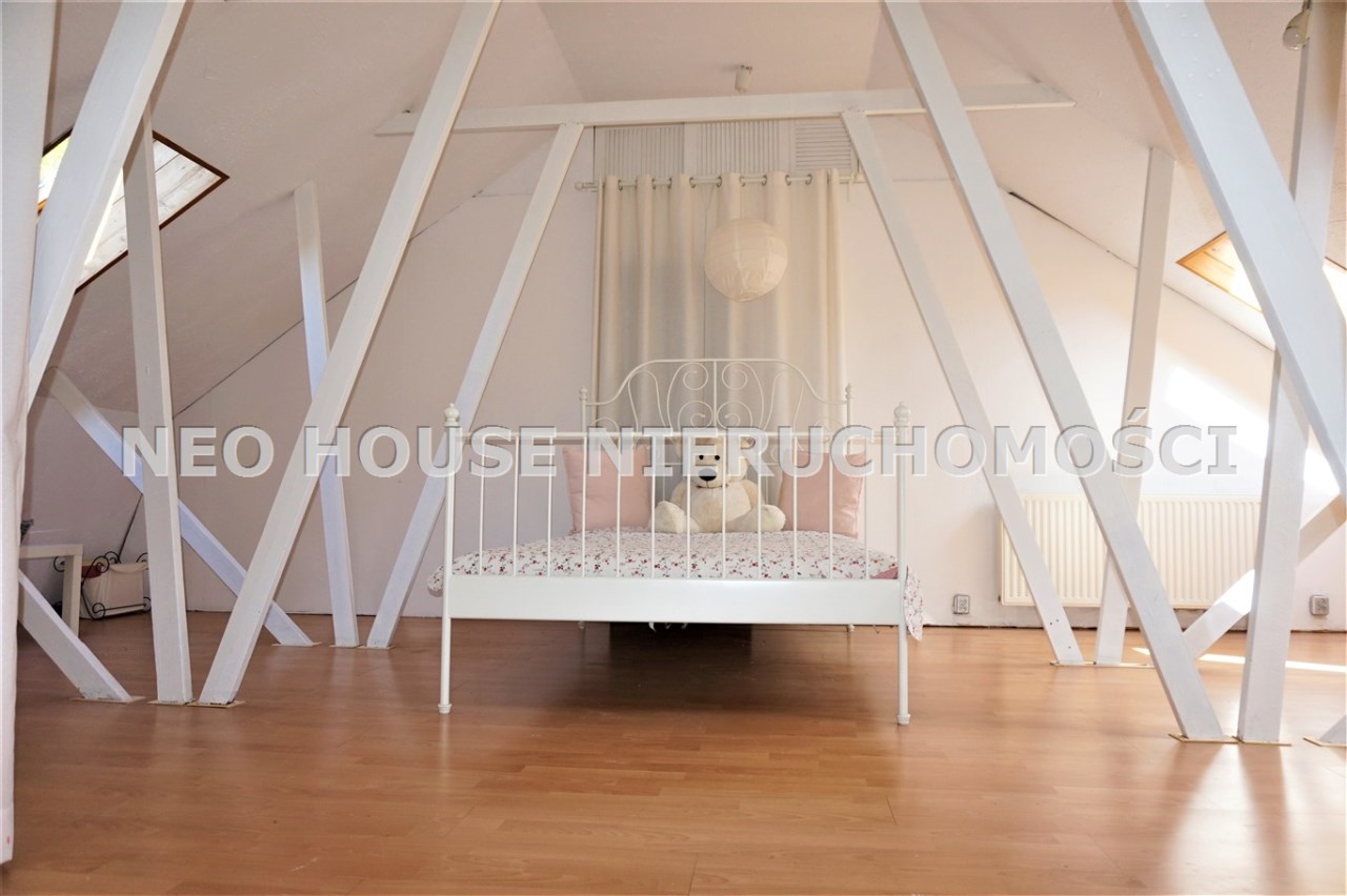 Belki podtrzymujące dach, pomieszczenie ze skosami, w najwyższym punkcie wysokość około 3m a pod oknami około 1,2m.